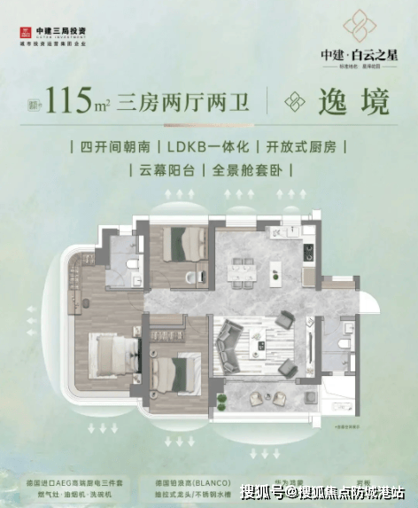 对于首次置业的年轻群体来说,中建白云之星的建面115㎡2+1房户型是完美的入门选择。该户型采用了经典的三开间朝南设计,确保了主要生活空间拥有充足的阳光照射。客厅与阳台相连,视野开阔,采光极佳。主卧带全景飘窗,不仅增加了室内使用面积,更提供了极佳的观景视角,让居住者在卧室就能欣赏到窗外的美景。